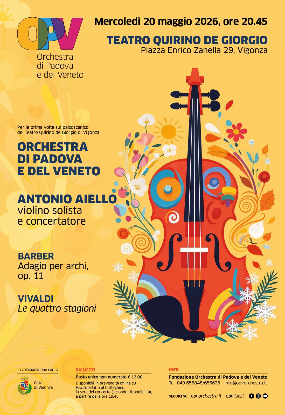 L'Orchestra di Padova e del Veneto con il violino solista Antonio Aiello porta a Vigonza l'Adagio per archi di Barber e le Quattro Stagioni di Vivaldi
