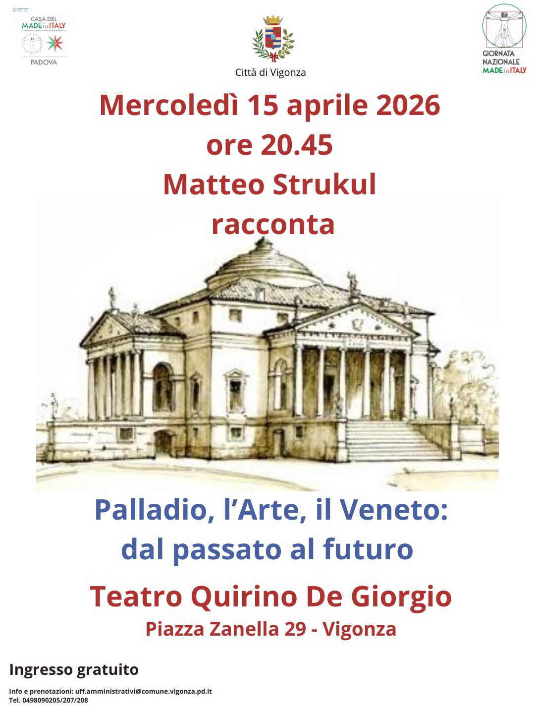 La Giornata del Made in Italy si conclude con un appassionante racconto di Matteo Strukul, che approfondirà il ruolo di Andrea Palladio nella storia dell’arte e del Veneto, in un excursus che tratterà non solo di arte e architettura, ma anche del rapporto stretto tra territorio e impresa nel corso dei secoli, con uno sguardo al futuro. Un evento che promuove l’idea di Andrea Palladio ambasciatore della Bellezza del Veneto.