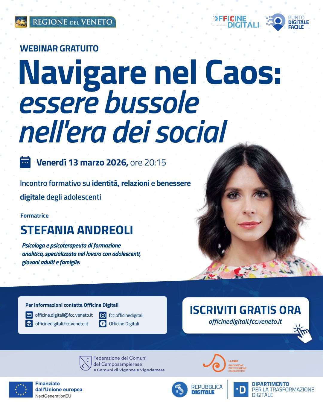 L'incontro si terrà online venerdì 13 marzo 2026, alle ore 20.15. La partecipazione è gratuita, per le iscrizioni officinedigitali.fcc.veneto.it